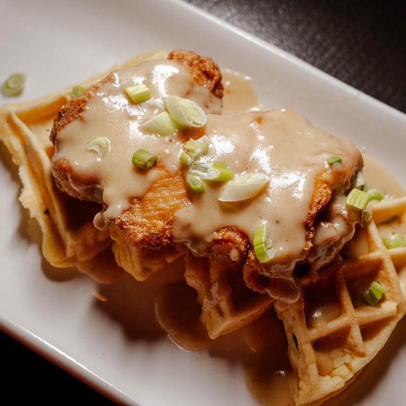 Enjoy our homemade chicken and waffles topped with our creative garnish.